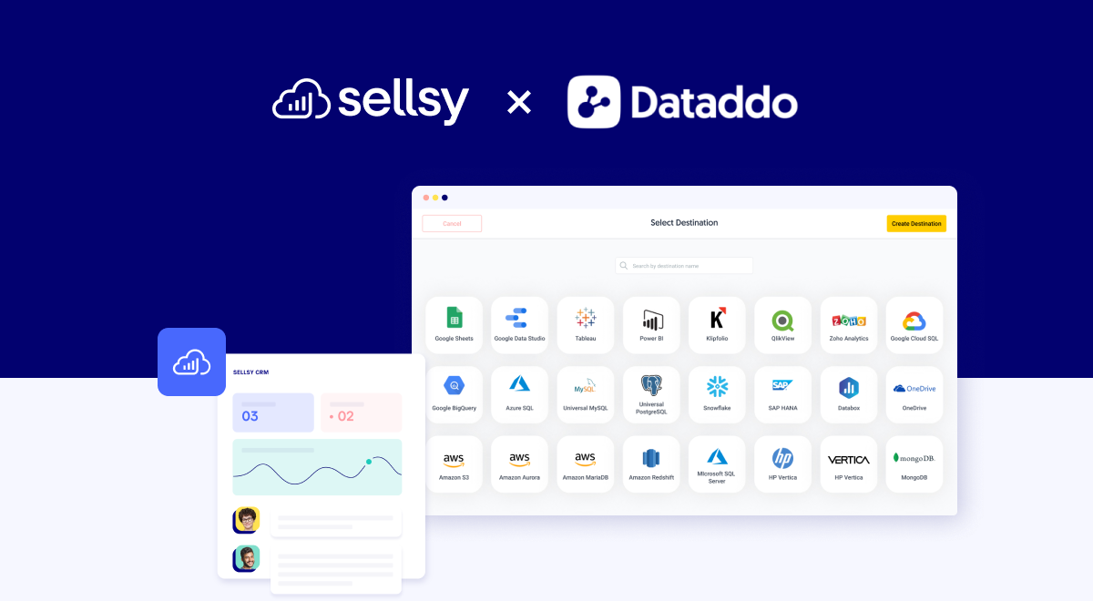 Avec Dataddo, intégrez et centralisez toutes vos sources de données, y compris Sellsy. Ensuite, envoyez-les facilement vers n'importe quel outil de BI ou entrepôt de données, sans modifier votre infrastructure data.