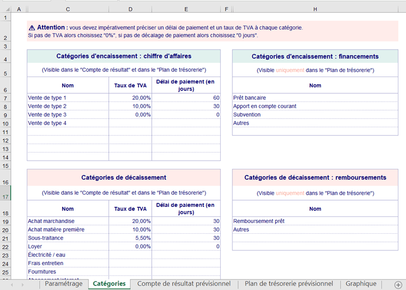 Cette étape est essentielle, car ces catégories seront reprises automatiquement dans le plan de trésorerie. Elles déterminent comment les flux sont regroupés et donc comment on analyse la situation financière.