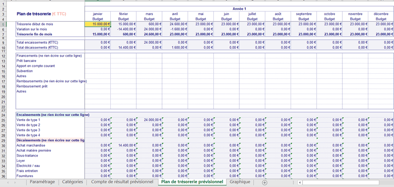 - Les flux sont saisis selon leur réalité bancaire. Le plan de trésorerie enregistre les mouvements au moment où l’argent entre ou sort.