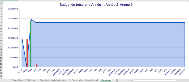 - Une vision globale facilite l’analyse. Le graphique synthétise l’évolution de la trésorerie et rend les tendances immédiatement lisibles.