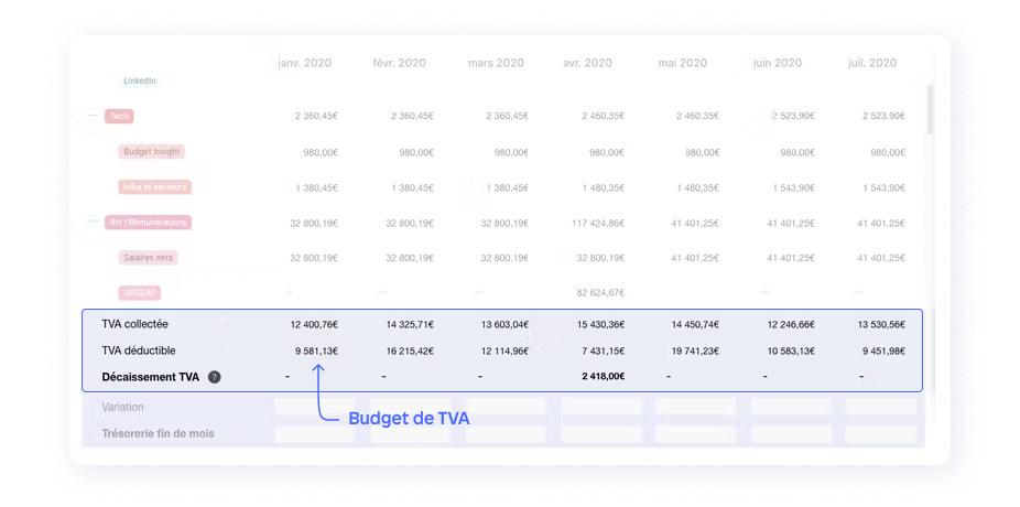 Dans l’onglet “Plan de trésorerie prévisionnelle” vous retrouverez en bas du tableau principal votre budget de TVA. Les montants de TVA collectée et déductible sont calculés à partir du paramétrage que vous avez réalisé précédemment. Pour chaque mois vous allez connaître votre solde de TVA et il est automatiquement pris en compte selon votre échéancier dans votre plan de trésorerie sur les lignes “crédit de TVA” et “décaissement de TVA”.
